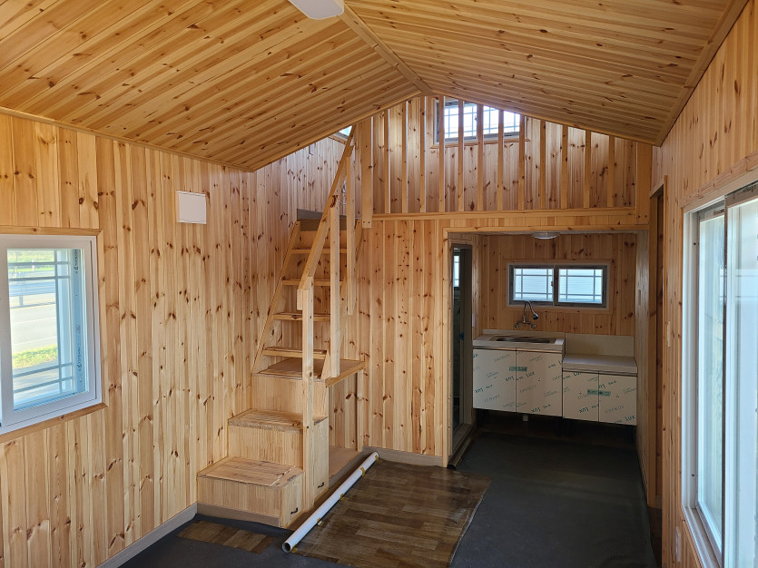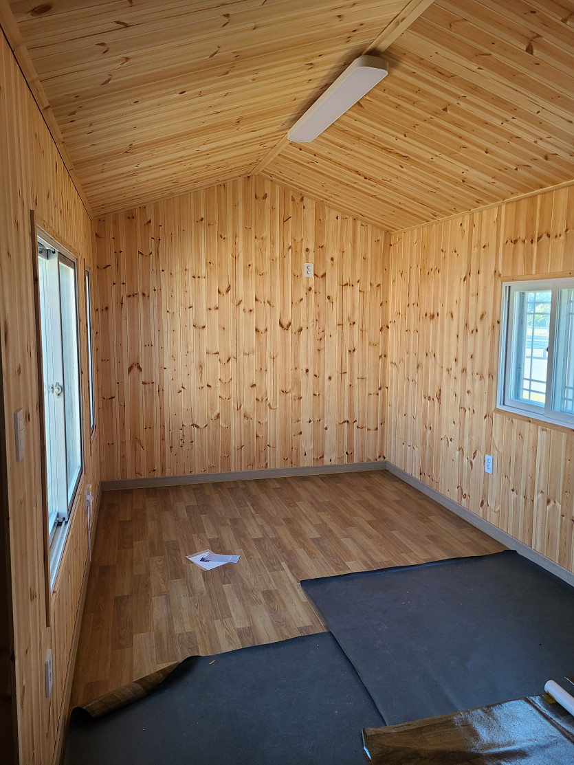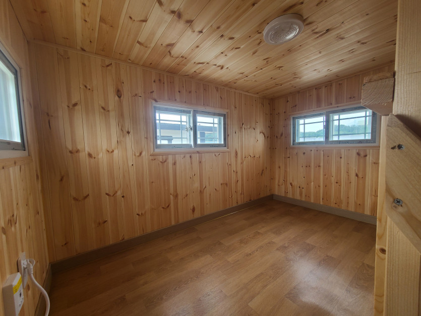 벽 : 스틸사이딩 (18T) +샌드위치 판넬 (100T) + 스치로폼 (100T) + 편백루바 마감