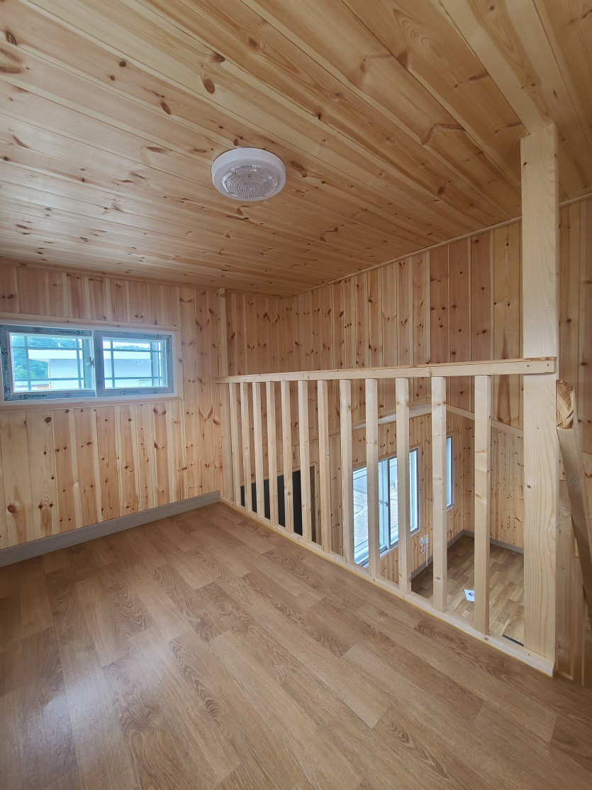 지붕: 아스팔트싱글 + 샌드위치 판넬 (100T) + 스치로폼 (100T) + 편백루바 마감